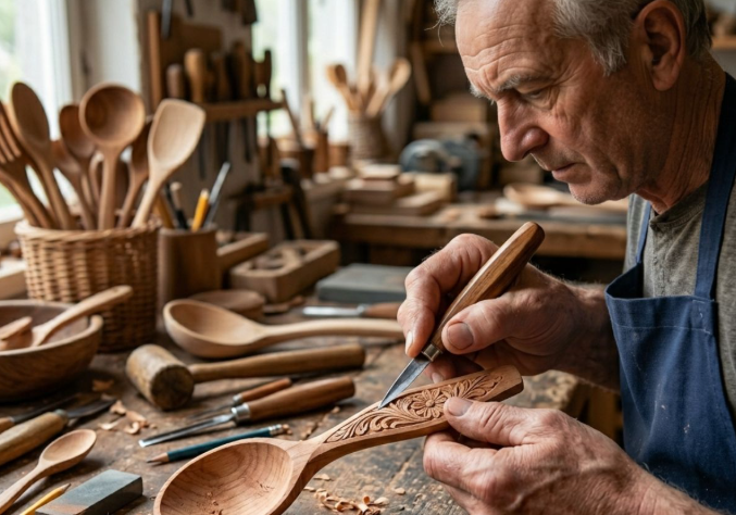 In spoon carving, special attention is given to bowl depth and handle balance to ensure comfort and usability. Every stage of wooden utensil carving requires patience, as rushing the process can compromise symmetry and structural strength.